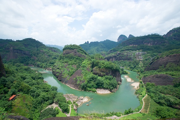 Dieser Fluss ist inmitten der tiefen Schluchten des Wuyi-Gebirges gelegen und etwa sieben Kilometer lang. Mit speziellen Booten können hier die Landschaft und die über 36 Felssäulen besichtigt werden. Das Wuyi-Gebirge ist besonders berühmt für seine ausgeprägte Flora und Fauna. Die speziellen Sorten des Wulong-Tees und die zahlreichen Heilkräuter, die in dem Gebiet angebaut werden, haben eine lange Tradition. Die prachtvollen Wälder sind der Lebensraum von über 700 Jahre alten Ginkgobäumen, mehr als 150 Vogelarten, sowie Reptilien und Amphibien.