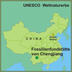 Das UNESCO Weltnaturerbe der Chengjiang-Faungemeinschaft in China verzeichnet die sehr frühe Bildung eines komplexen marinen Ökosystems. Diese fossile Fauna ist eingebettet in dem 50 Meter tiefen und sich tausende von Quadratkilometern erstreckenden Maotianshan-Schiefer, einem geologischen Schichtenverband, benannt nach dem Hügel des Maotianshan. Die Konservatlagerstätte wurde 1984 zufällig entdeckt und erwies sich als ca. 10 Millionen Jahre älter als etwa die Burgess-Schiefer in Kanada. Die Sammlung der fossil erhaltenen Lebensgemeinschaft weist Funde von wirbellosen Tieren als auch Wirbeltieren auf, deren Anatomie hartes und weiches Gewebe zeigt. Funde von fossilisiertem Körpergewebe wie in der Chengjiang-Faunengemeinschaft sind äußerst selten, weitere derartige Entdeckungen gab es noch in der Ediacara-Fauna in Australien sowie im Burgess-Schiefer Kanadas.